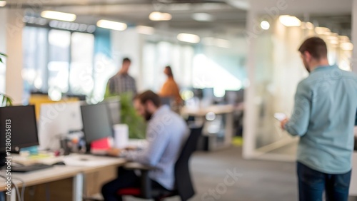 Blurred Modern Office Workspace: Coworkers Collaborating