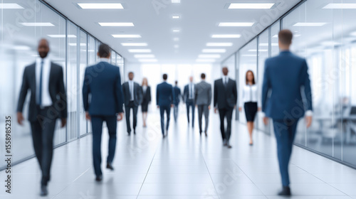 Blurred motion of people walking in eco-friendly office modern workspace professional environment dynamic viewpoint