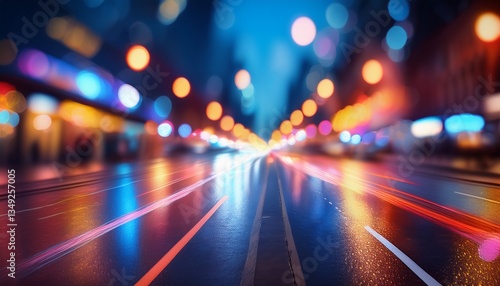 Blurred neon street bokeh effect with a mix of blue, red, and yellow
