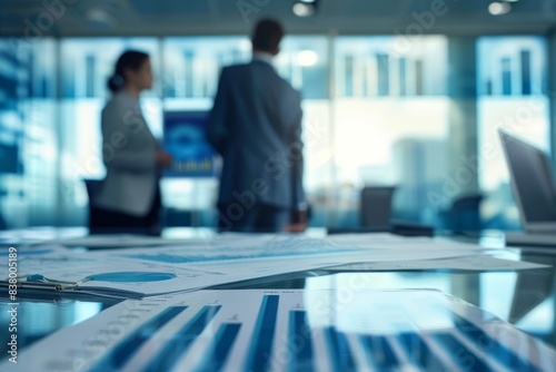 Blurred office workers discuss financial charts in modern conference room with cityscape views, focusing on business graphs and documents.