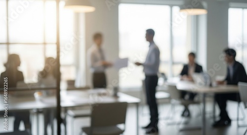 Blurred office workspace, interior workplace with cityscape for business presentation background