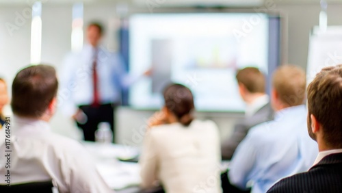 Blurred Office Workspace Presentation: A blurred office setting with a business professional delivering a presentation to colleagues.
