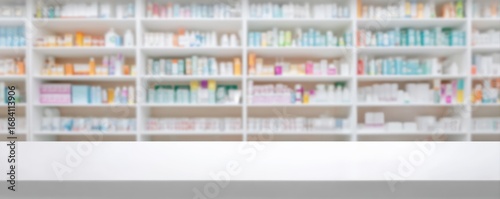 Blurred pharmacy shelves filled with various medications create a backdrop for a clean, empty white counter, highlighting the retail space