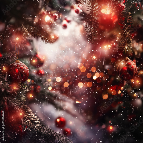 blurred red & orange christmas holidays background with xmas tree, lights & baubbles; bokeh effect; magical backdrop