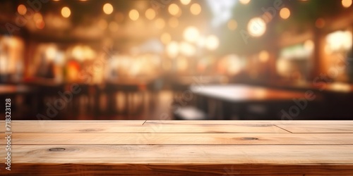 Blurred restaurant or coffee shop background with empty wooden table for product display.