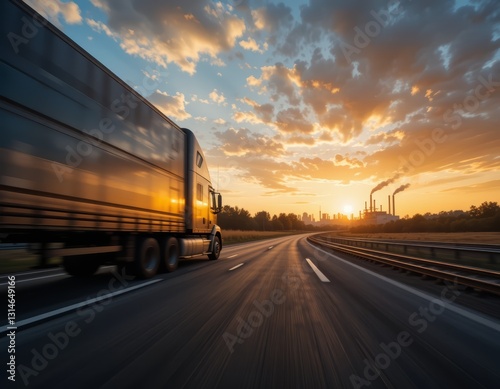 blurred semi-truck speeding on a curved highway at sunset with smokestacks, logistics, delivery,