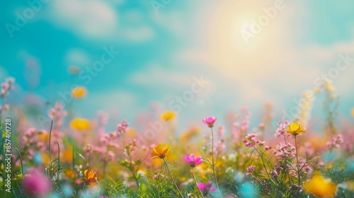 Blurred springtime landscape with a blue sky and flower meadow in the background