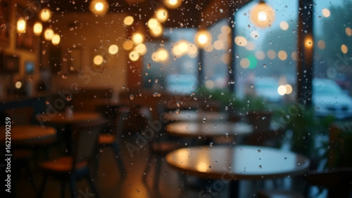 Blurred view of a coffee shop viewed through a rainy window. Soft bokeh light from hanging lights inside, blurred shadows of tables and chairs, water drops on the glass in the foreground.
