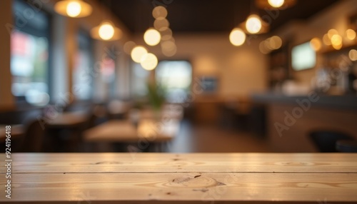 Blurred view of a cozy cafe interior with warm lighting and wooden tables.