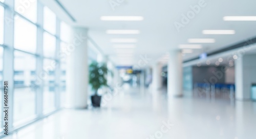 Blurred view of a modern airport terminal with bright lighting and a potted plant in the foreground