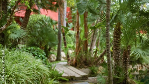 Blurred view of a tropical resort garden with lush greenery, palm trees, and a wooden walkway, capturing a serene outdoor luxury atmosphere with vibrant flora and bokeh effect.