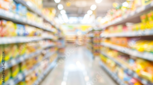 Blurred view of a well-stocked grocery aisle in a supermarket with various food products on shelves, creating a bright and vibrant shopping atmosphere.