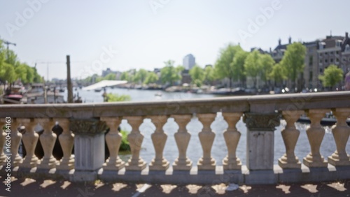 Blurred view of amsterdam canal scene with stone railing in foreground and green trees lining the water under clear sky.
