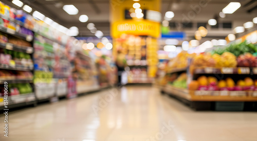Blurred view of grocery store aisle with shelves stocked with various products.grocery premium photos for banner, poster, and pamphlet backgrounds