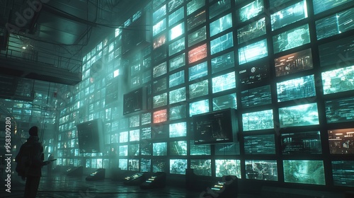 Blurred wall of television screens broadcasting 24/7 news and media. Concept of internet, AI, and nonstop data.