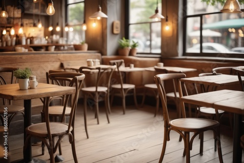 blurred Warm light fills a luxurious restaurant interior with empty wooden tables and plush chairs set for a romantic dinner
