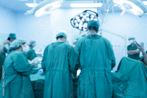 Blurry medical team of surgeons in hospital working surgical intervention.Surgery operating room with electrocautery equipment for cosmetic surgery.Surgeon gloved hands hold the instruments.
