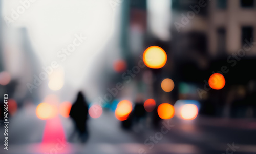 Blurry street scene with person walking and lights in urban environment.