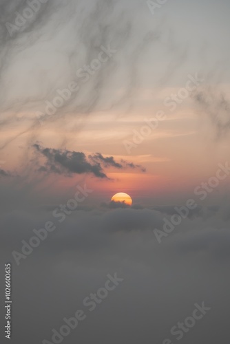 Blurry view of a sunset in muted gray hues amidst clouds.