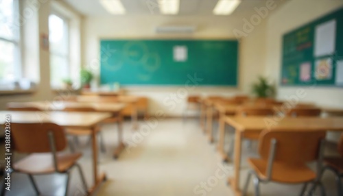 Blurry view of elementary class room no kid or teacher with chairs and tables in campus. Back to school concept created with generative ai