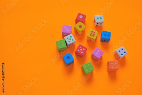 Board games concept. games of chance. Multicolored cubes set close-up on a bright orange background.Figures and numbers concept. copy space.