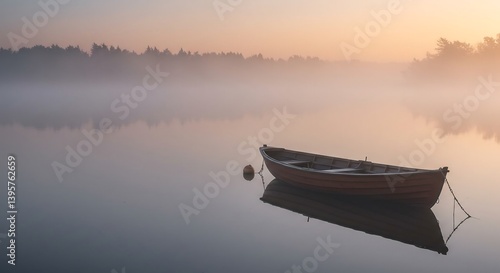 Boat Floating on Misty Lake at Sunrise with Calm Reflections