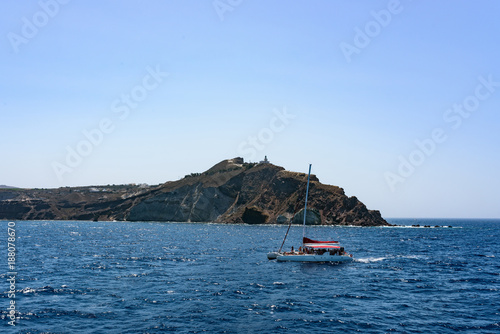 Boat with tourists near Santorini islands. Greece in summer.