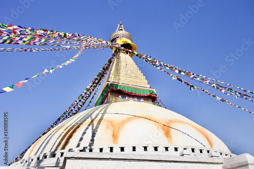 Bodnath Stupa in Kathmandu close up view on bright blue clear sunny sky background. Traditional buddhist architecture. Buddhist symbols. Ancient Buddhist Stupa and prayer flags in Nepal in sunny day.