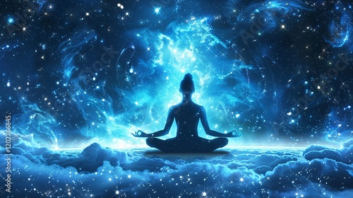 Bohemian-style meditation with spiritual balance and energy fields in a cosmic backdrop