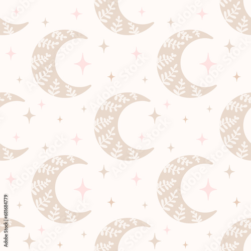 Boho style crescent seamless pattern. Half moon witn floral pattern.