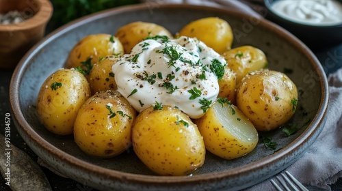 Boiled potatoes with sour cream, garnished with herbs, arranged on a rustic plate. A simple yet hearty side dish perfect for any meal.