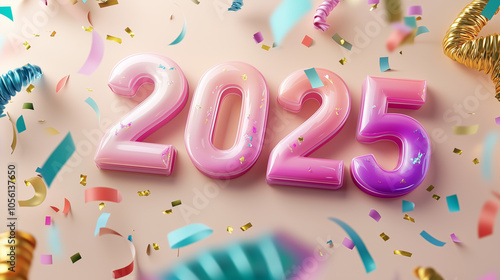 Bold and shiny 3D 2025 numbers in pastel and neon colors surrounded by sparkling confetti and gold streamers