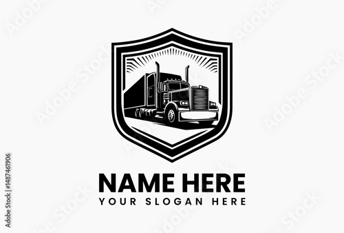 Bold black and white vector logo emblem featuring a powerful semi-truck with a trailer, set against a backdrop of dynamic horizontal and triangular stripe patterns. Transportation logo concept