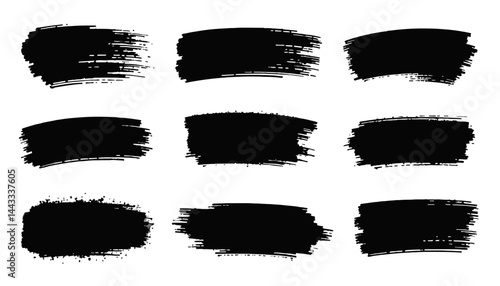 Bold Brushstroke Collection: A set of nine bold brushstrokes in black, showcasing textures and creative strokes perfect for graphic design assets and visual compositions.