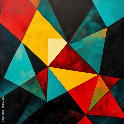 Bold geometric triangular shapes in vibrant colors create a striking abstract composition on a black background