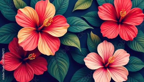 Bold hibiscus motif, stylized blooms, contrasting colors , leaves, blossom, art