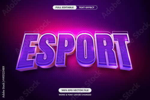 Bold purple esport text effect with a vibrant pink glow and striped design. Ideal for gaming covers, team logos, and digital banners. Fully editable vector format