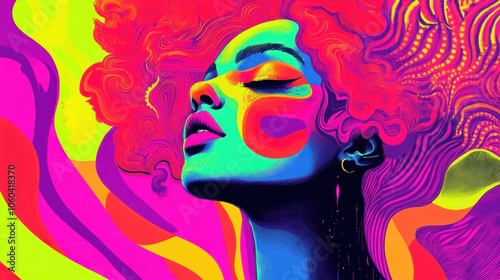 Bold, retro-inspired psychedelic art with vibrant swirls, neon colors, and digital effects