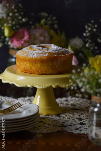 Bolo de fubá com cobertura de açúcar em ambiente decorado com flores