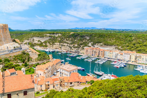 BONIFACIO PORT, CORSICA ISLAND - JUN 24, 2015: View of beautiful port with colorful houses and boats on sunny summer day. This French island is popular tourist destination in Europe.