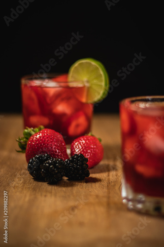 Bonito Cóctel con fresas, zarzamoras y una rodaja de limón para adornar en un fondo negro y de madera