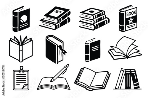 Book Icon Set – Minimalist Black & White Vector Icons of Open, Closed, and Stacked Books for Web & Education
