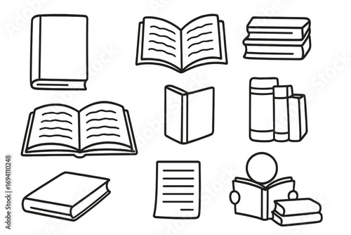 Book icon set vector collection. Simple doodle outline of books for reading and education. Hand drawn library, learning, literature, and study symbols. Minimalist sketch.