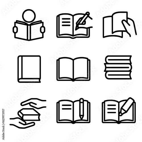 Book Icons Set. Outline icon set of book actions: reading book, writing notes, flipping page, closing book, opening book, stacking