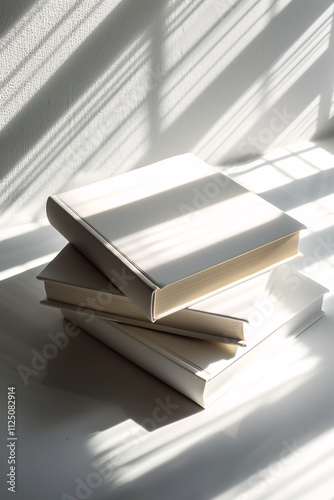 Book Mockup, a stack of three white mock-up books placed on a corner of a white table. The sunlight filtering casting dynamic geometric shadows across the books