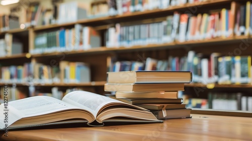 Book stack and opened book on the desk on blurred bookshelves in light public library room background : Generative AI