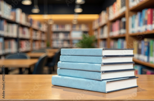 Book stack on the desk in public library