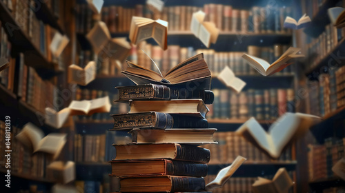 Books fly through the air in a library, creating a chaotic and whimsical scene.