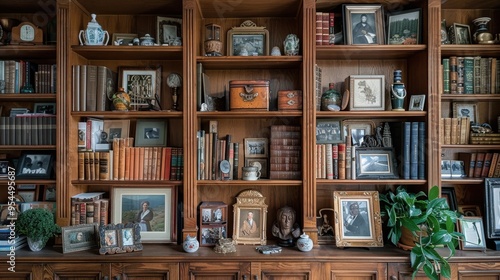 Bookshelf: A wooden, tall bookshelf with several shelves displays an assortment of novels, framed photos, and decorative pieces, featuring hardcovers, paperbacks, and family keepsakes.