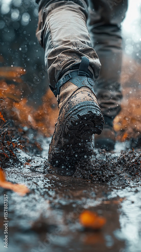 Boots of a nature explorer walking through mud and water. Forest trail with puddles in front of him. Sturdy hiking shoes emphasize both comfort during exploration and high-end functional style for out